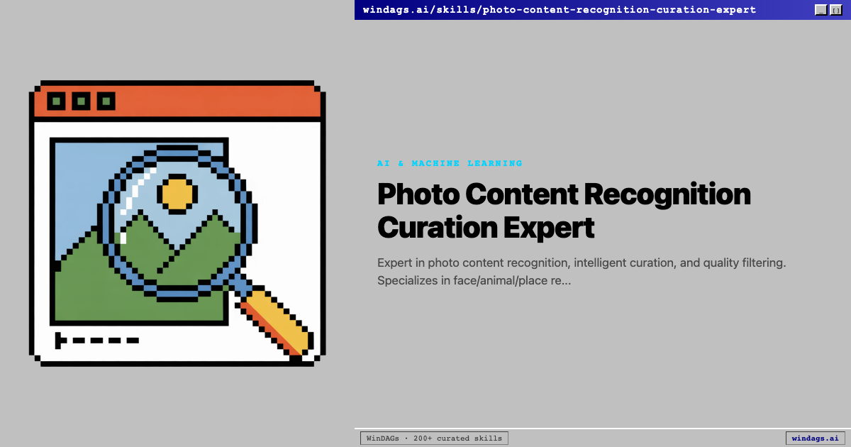 Expert in photo content recognition, intelligent curation, and quality filtering. Specializes in face/animal/place recognition, perceptual hashing for de-duplication, screenshot/meme detection, burst photo selection, and quick indexing strategies. Activate on 'face recognition', 'face clustering', 'perceptual hash', 'near-duplicate', 'burst photo', 'screenshot detection', 'photo curation', 'photo indexing', 'NSFW detection', 'pet recognition', 'DINOHash', 'HDBSCAN faces'. NOT for GPS-based location clustering (use event-detection-temporal-intelligence-expert), color palette extraction (use color-theory-palette-harmony-expert), semantic image-text matching (use clip-aware-embeddings), or video analysis/frame extraction.