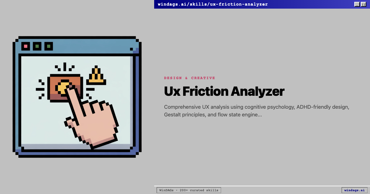 Comprehensive UX analysis using cognitive psychology, ADHD-friendly design, Gestalt principles, and flow state engineering. Specializes in friction audits, user journey simulation, cognitive load optimization, and Fitts' Law application. Activate on "analyze UX", "friction audit", "user journey", "ADHD-friendly", "optimize flow", "reduce cognitive load", "UX audit", "conversion optimization". NOT for visual design execution (use web-design-expert), A/B testing implementation (use frontend-developer), or accessibility compliance auditing (use accessibility-auditor).