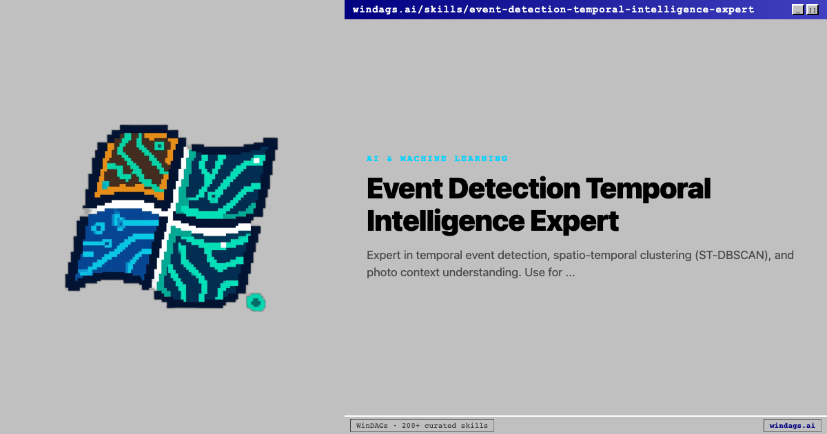 Expert in temporal event detection, spatio-temporal clustering (ST-DBSCAN), and photo context understanding. Use for detecting photo events, clustering by time/location, shareability prediction, place recognition, event significance scoring, and life event detection. Activate on 'event detection', 'temporal clustering', 'ST-DBSCAN', 'spatio-temporal', 'shareability prediction', 'place recognition', 'life events', 'photo events', 'temporal diversity'. NOT for individual photo aesthetic quality (use photo-composition-critic), color palette analysis (use color-theory-palette-harmony-expert), face recognition implementation (use photo-content-recognition-curation-expert), or basic EXIF timestamp extraction.